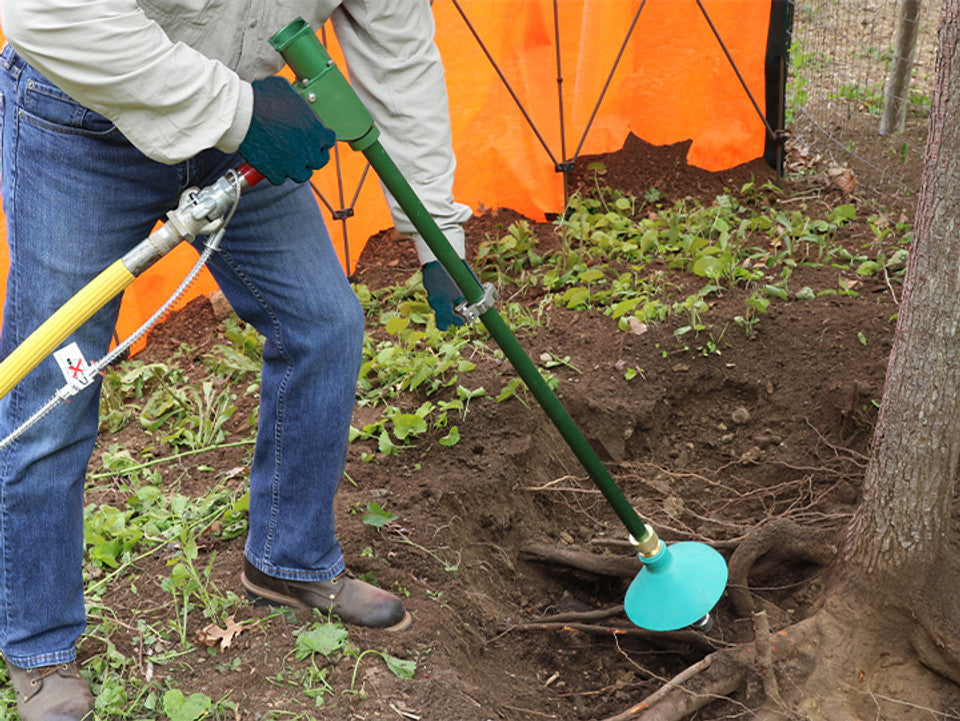 The Arborjet Supersonic Air Knife is the game-changing ultra-light pneumatic soil excavation tool for vertical mulching, radial trenching, bare-rooting, and more! The Mach 1.3 air separates the soil particles apart for super-fast digging without harming trees, buried utilities, and sewage lines. This 'Liquid' version of the Air Knife uses the same lightweight technology of the Air Knife LT, but includes an extra garden hose connector to add water to your supersonic stream - helping to cut into the most compacted soils. Once you've dug your hole, you can use the Supersonic Vacuum (sold separately running on the same compressor to remove the debris you've loosened.