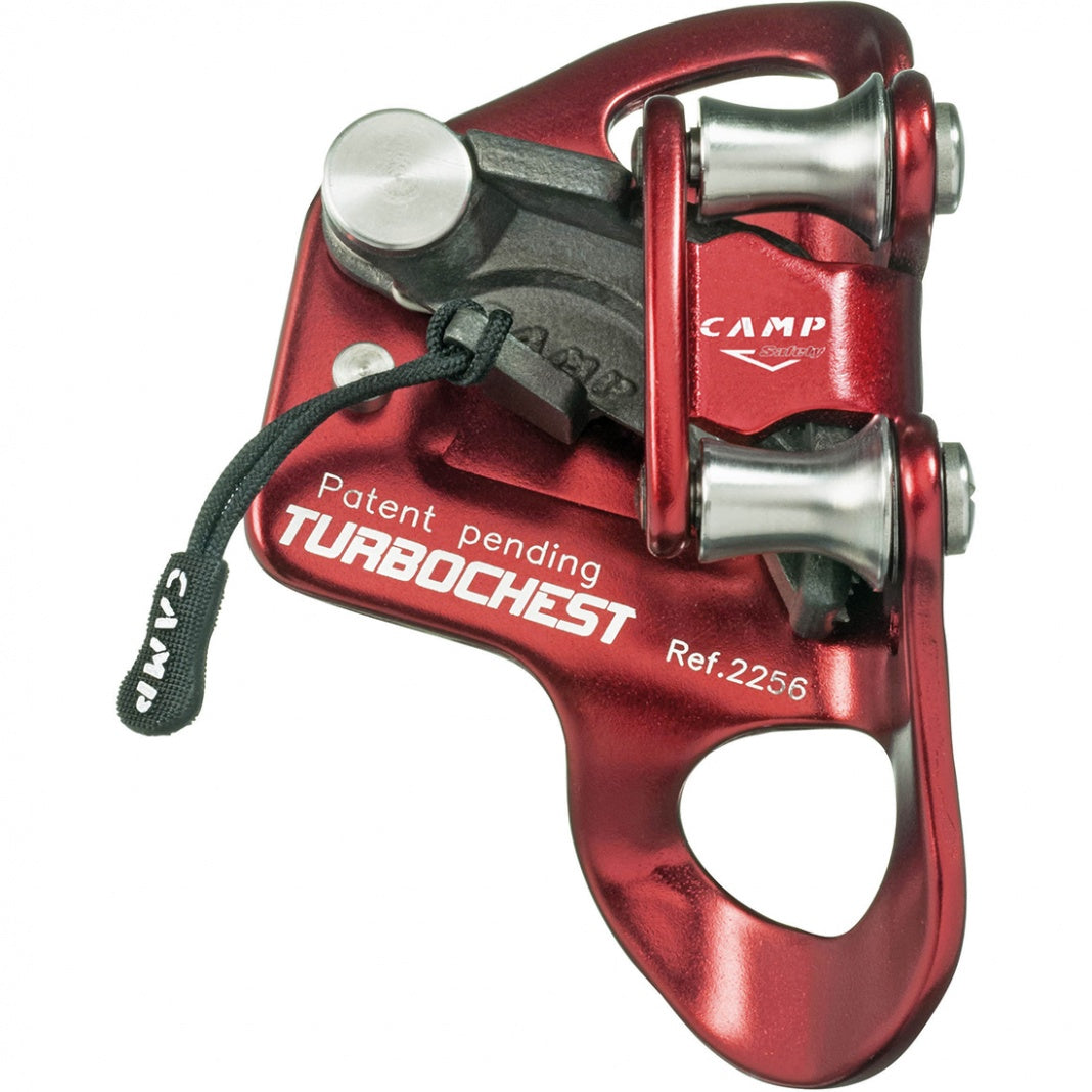 A revolutionary chest ascender that features two proprietary rollers for a smooth interface with the rope. This not only helps with climbing efficiency by making the upward glide much smoother. It also reduces dangerous wear on the device where the rope tends to rub on the body of a traditional ascender. The perfectly profiled closure keeps the rope in line with the body of the device and the rollers to prevent the rope from escaping the device during tight pendulums and traverses. The toothed cam is finished with a special anti-wear treatment and features drain holes to help prevent the build up of mud, grit and ice. The main body also features drain holes along the rope path to allow grit and moisture to escape during use for better contact with the rope. Thicker body plates and a shaped connection point reduce wear on the device caused by shifting between the device and the connector (especially when used with steel connectors). This also keeps the device more in-line with the body during use. The opening mechanism is simple and secure with the ability to lock the device open for easier attachment and a removable pull cord that makes it easier to operate while wearing gloves. The proprietary rollers also allow the Turbochest to be rigged as a locking pulley for light hauling with a max load of 50 kg, 110 lbs.