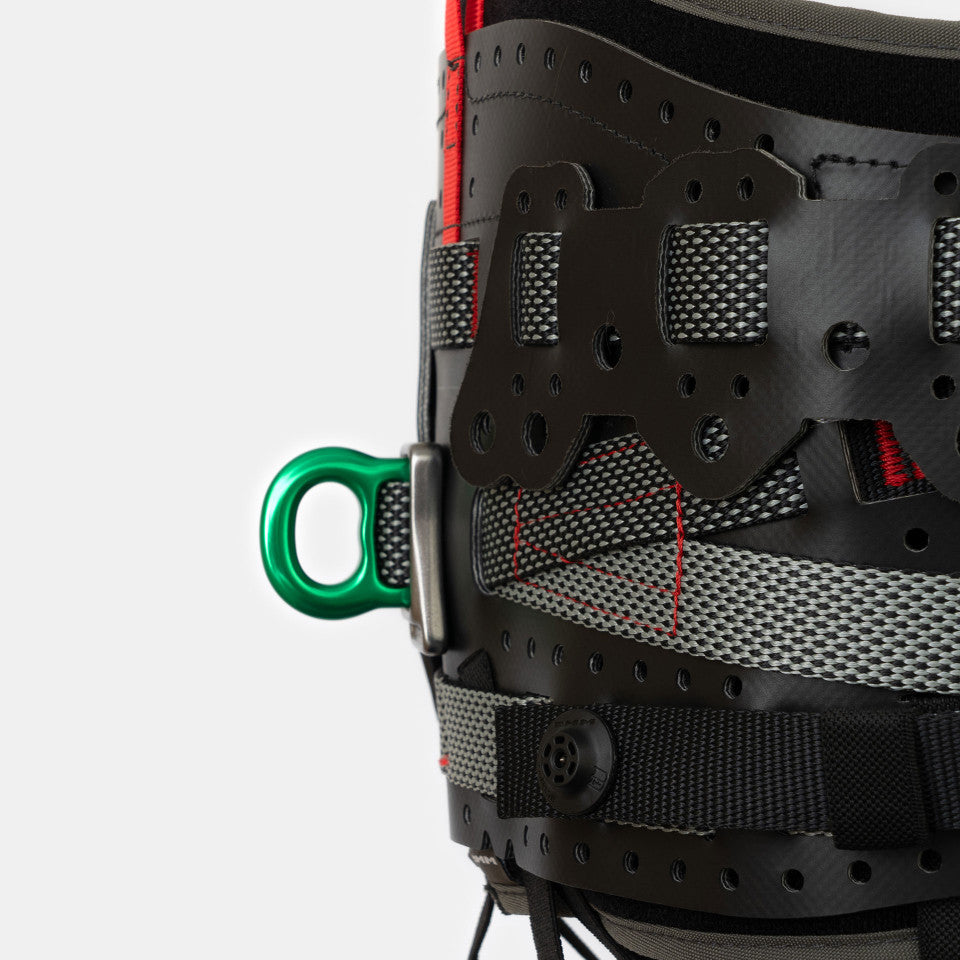 Harness attachments for restraint according to EN358. Rear restraint point can be used with classic DMM hardware such as the PerfectO, Ultra O, and AmericanO.